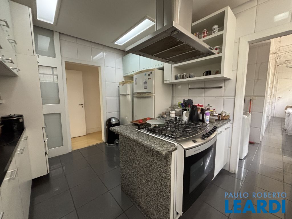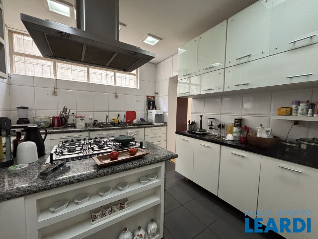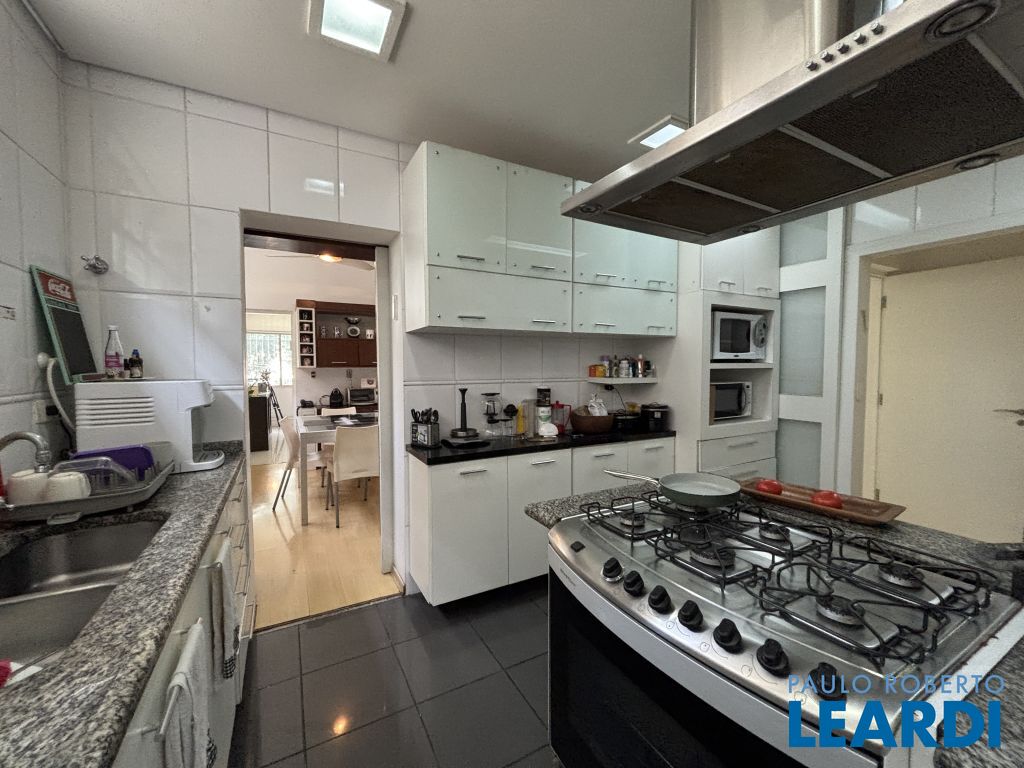 A cozinha foi toda reformada, é repleta de armários planejados de ótima qualidade e possui um fogão em ilha além de bancada em granito com duas pias. Uma ampla sala de almoço, entre a sala de jantar e a cozinha, proporciona refeições mais confortáveis junto à família.