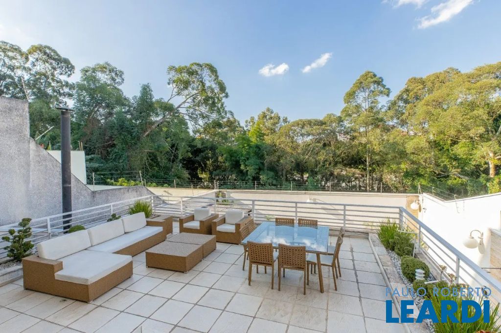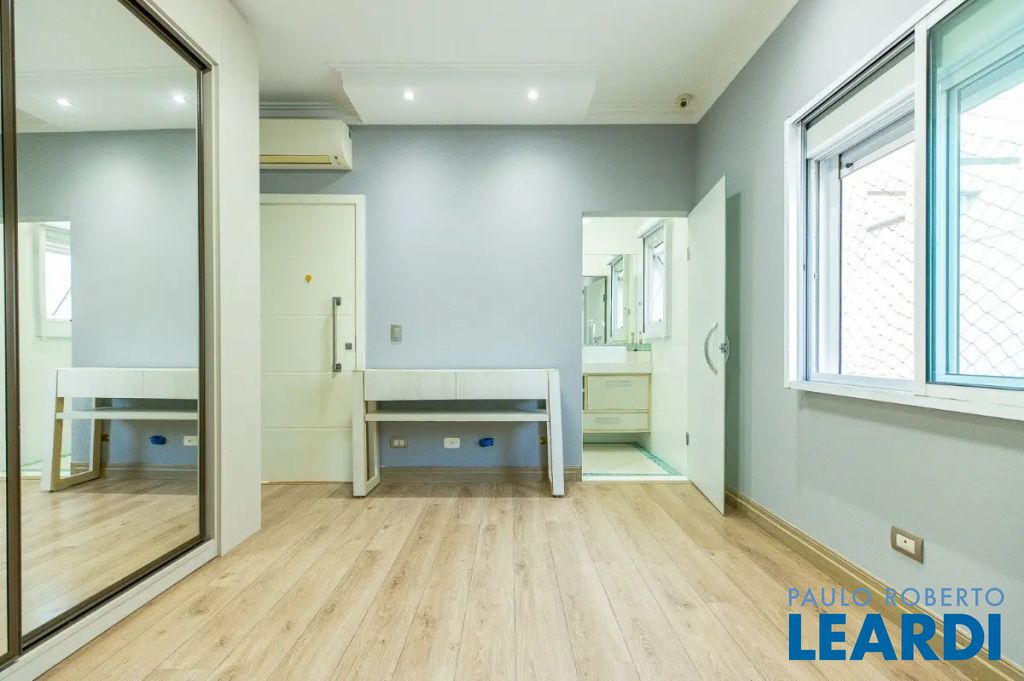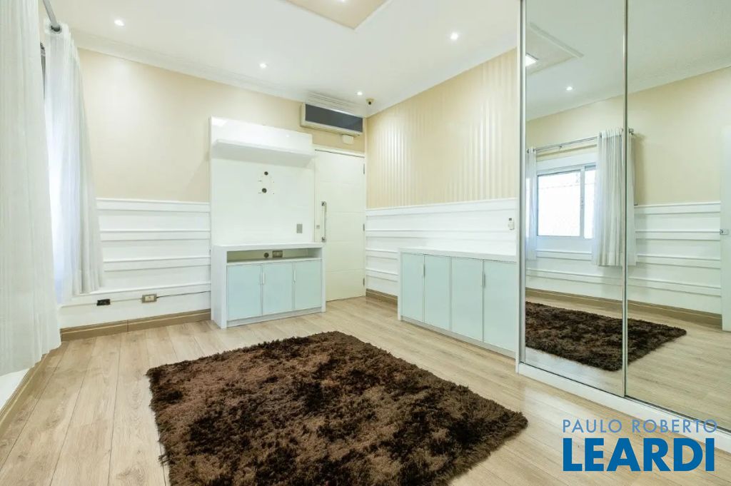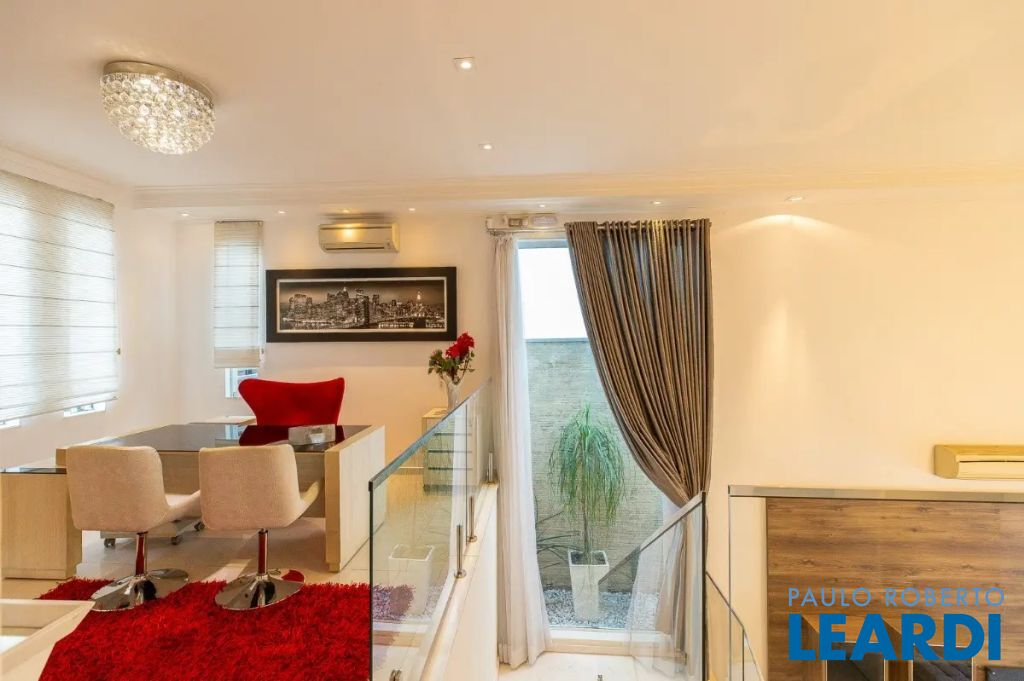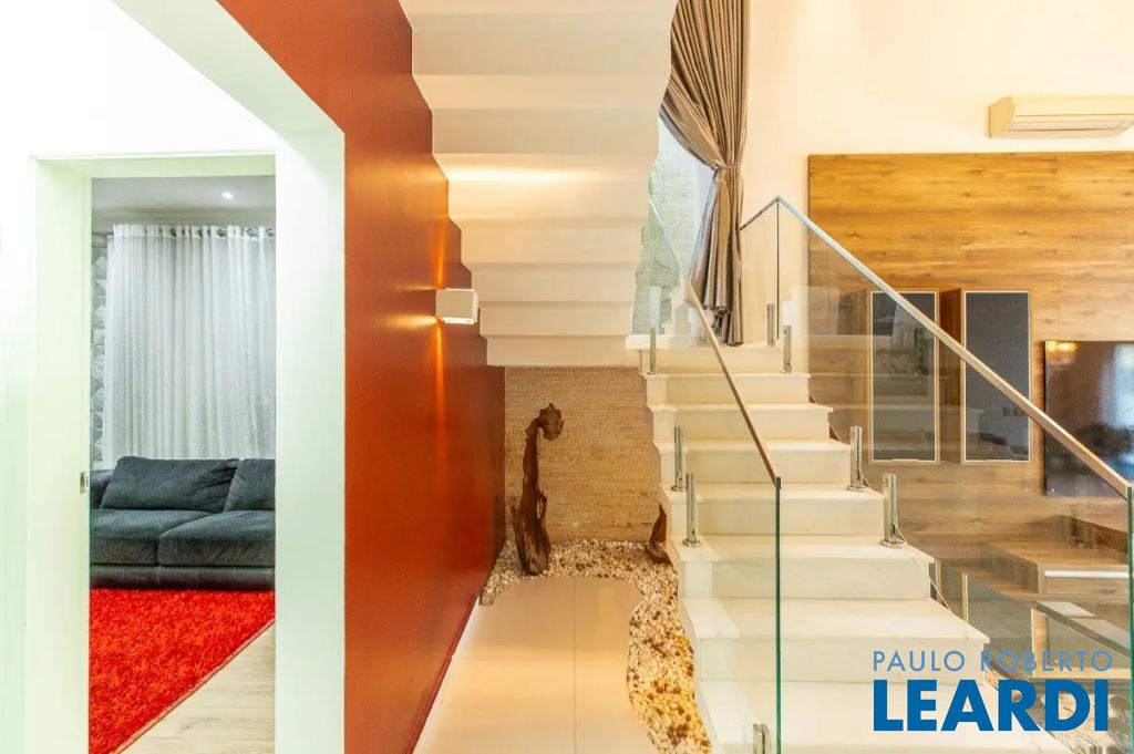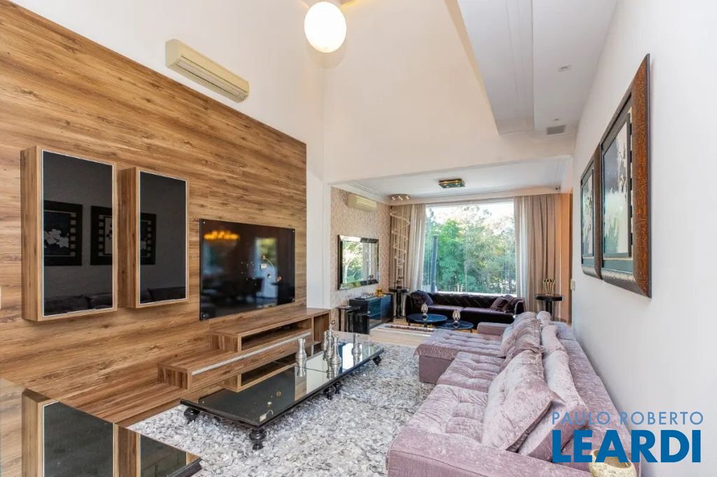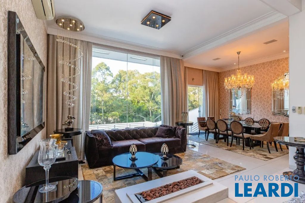 Descendo 1 lance em uma escada toda em mármore branco e guarda corpo em vidro temperado, chegamos a uma magnífica sala com 3 ambientes com pé direito triplo. Um jardim suspenso que cria um cenário lindo! Os móveis todos planejados, peça exclusivas de muito bom gosto e luxo. Lareira em mármore à gás de pedra vulcânica, lustres de cristal sinuosos e imponentes, tapete de couro com detalhes em ouro e Cortina Elétrica acionada por controle.