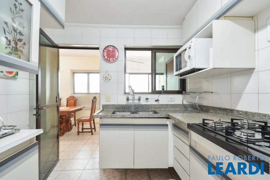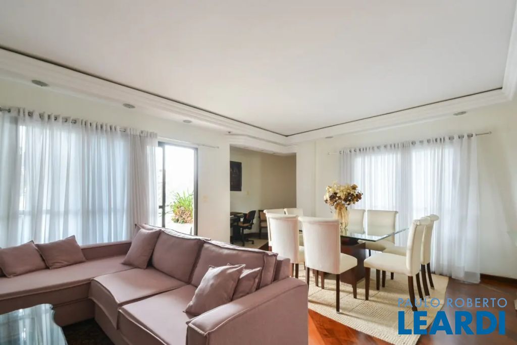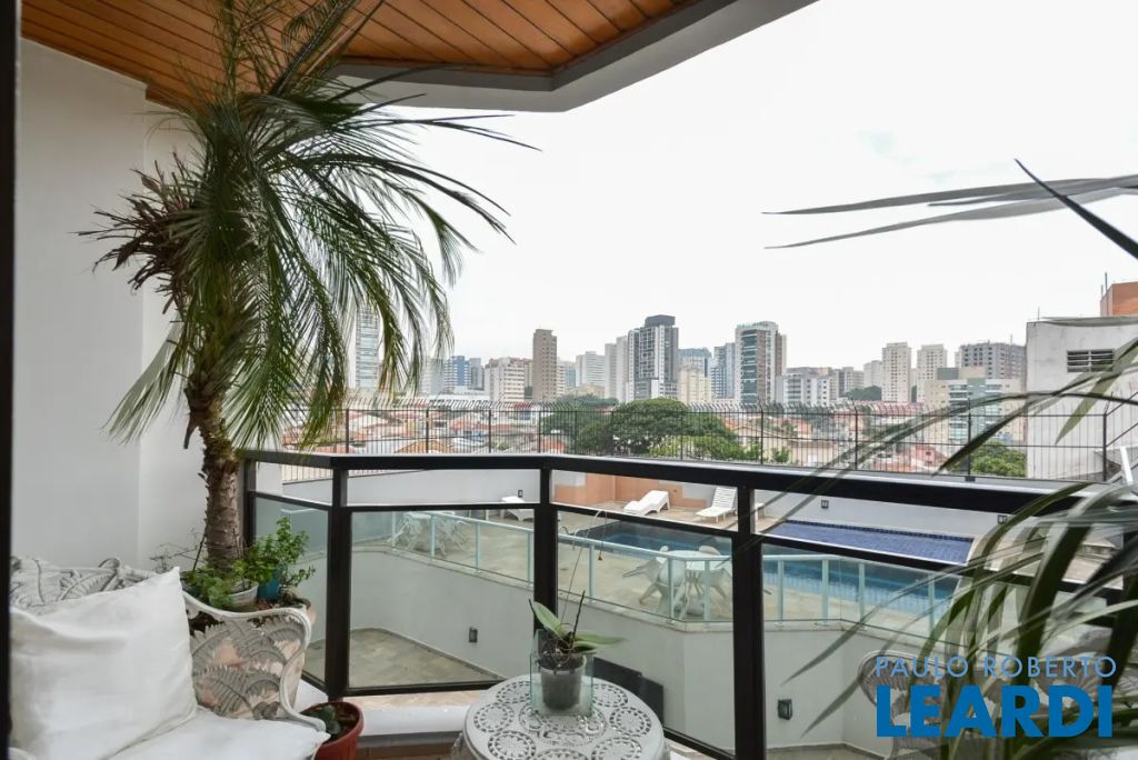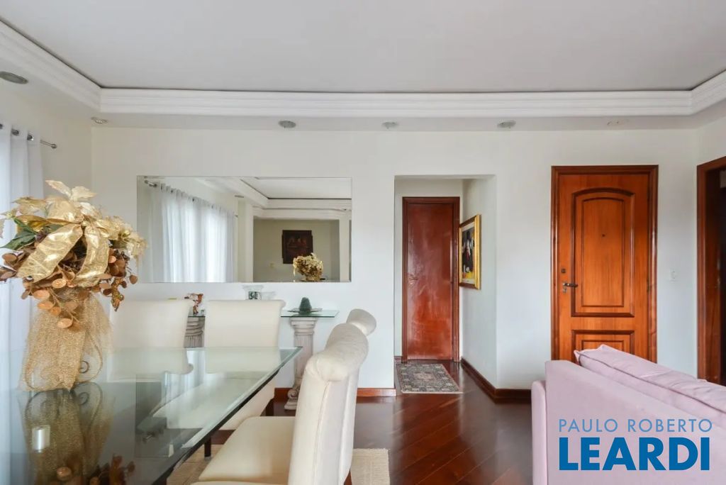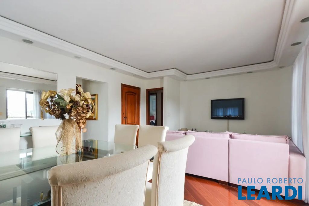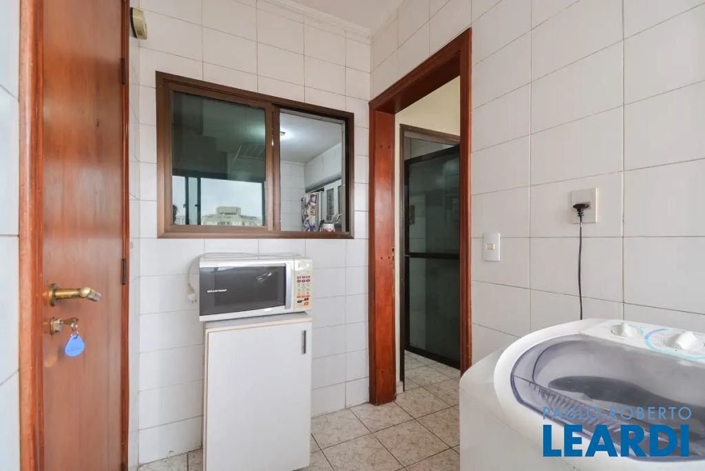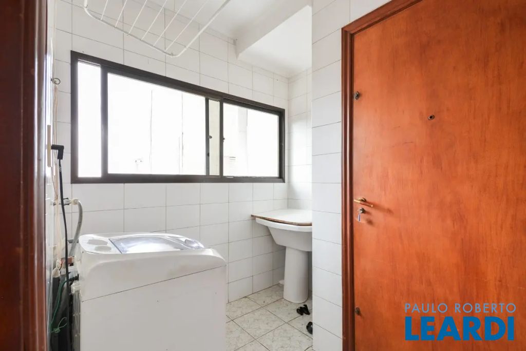 O imóvel conta com três suítes, quatro banheiros e duas vagas de garagem determinadas. As características incluem água quente, área de serviço, interfone, lavabo, móveis planejados, piso de madeira e sacada.