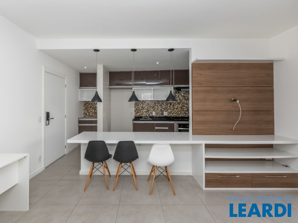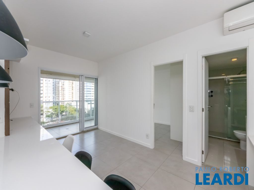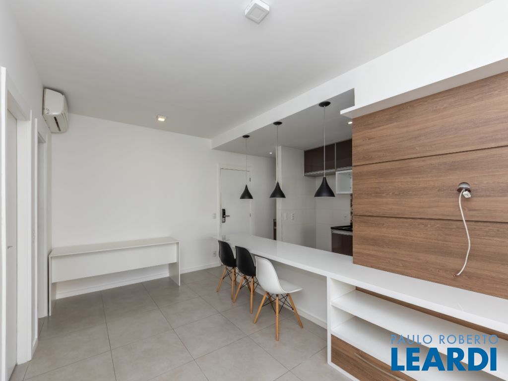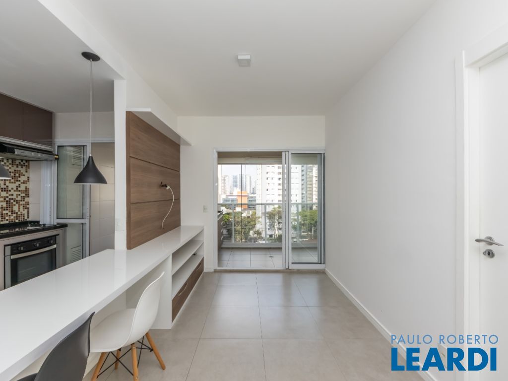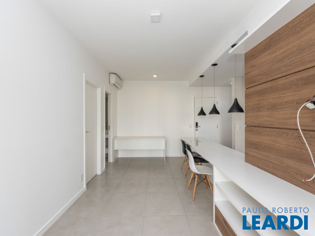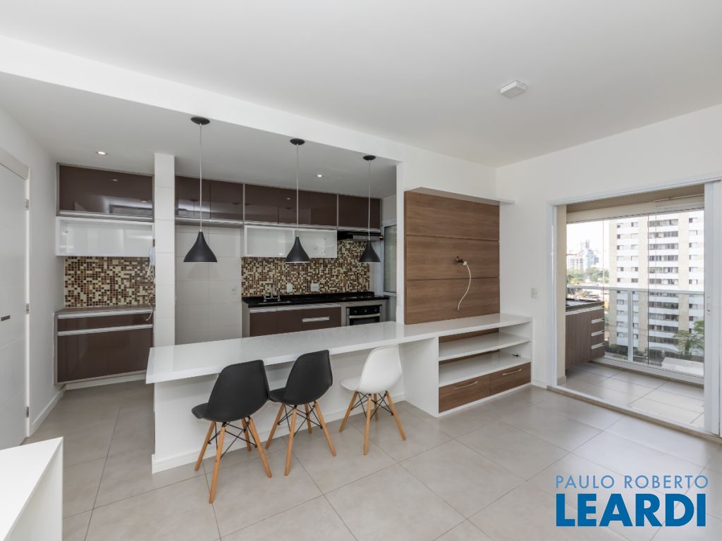 O imóvel conta com cozinha integrada à sala, área de serviço, 1 dormitório com ar-condicionado, banheiro e uma varanda ampla que valoriza o espaço e permite diferentes possibilidades de uso. Possui ainda 1 vaga de garagem indeterminada.