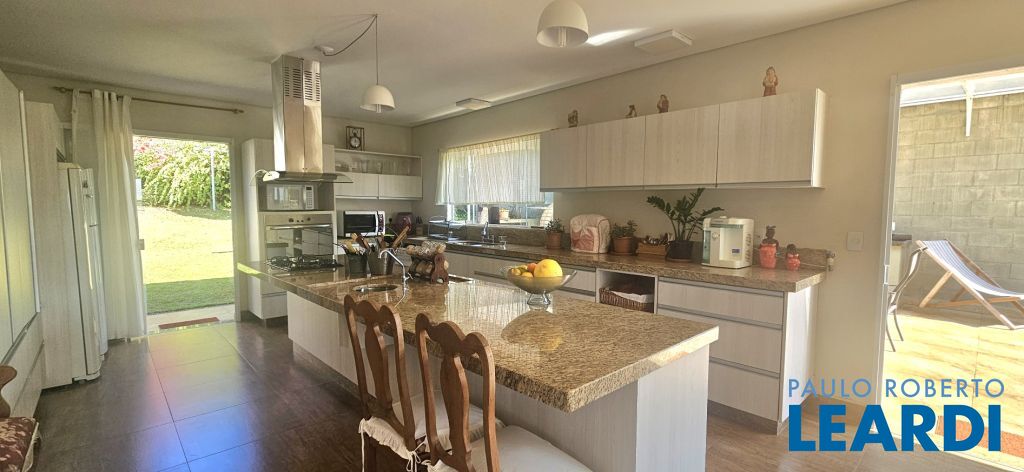 Cozinha espaçosa integrada à sala de jantar com linda vista