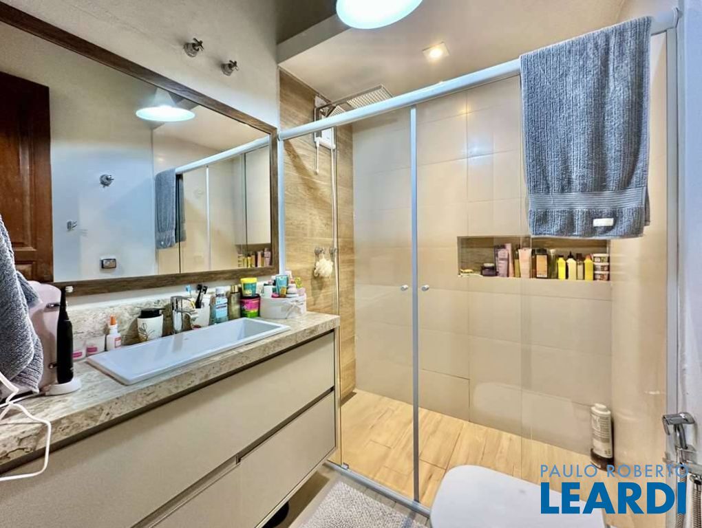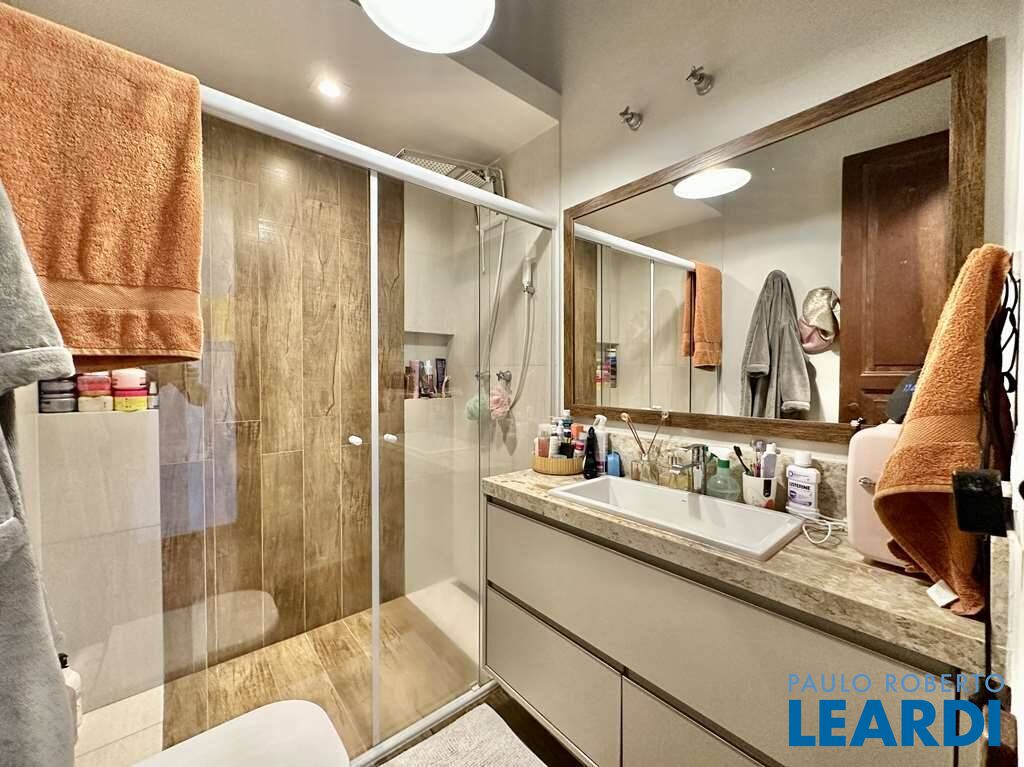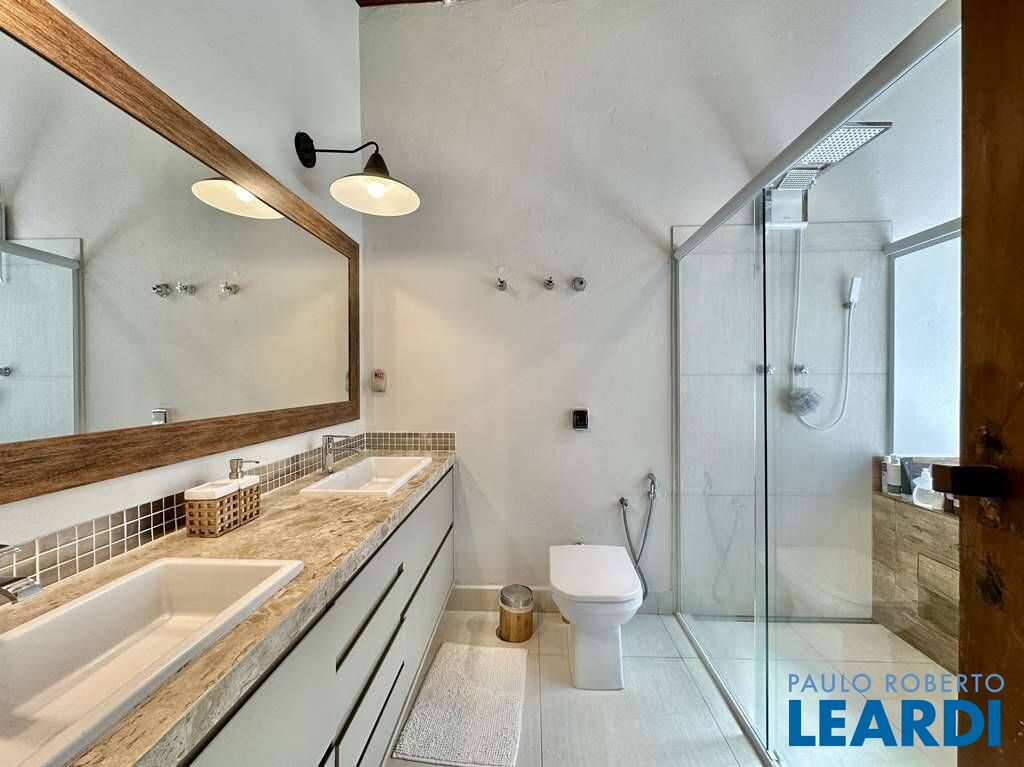 Banheiros com espelho, gabinetes e box de vidro, sendo a master com lavatório externo e hidro.