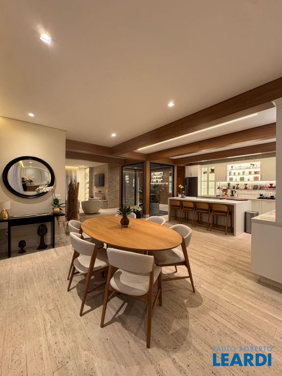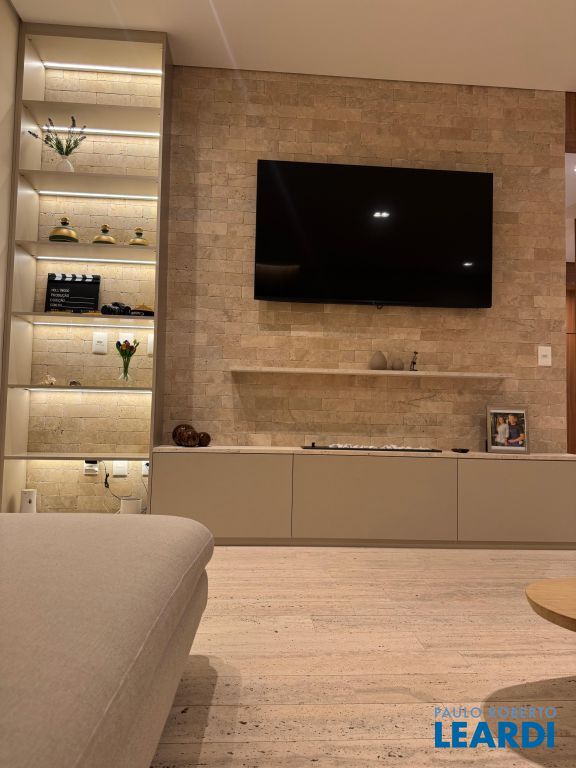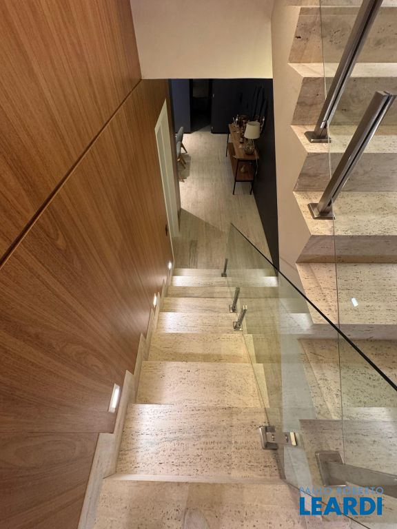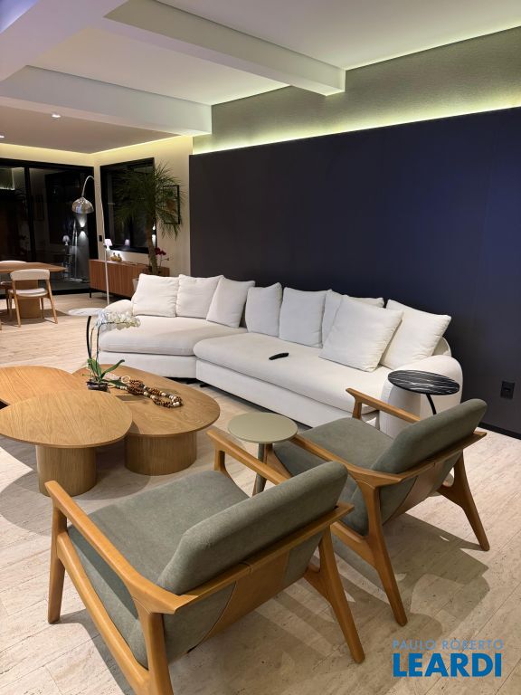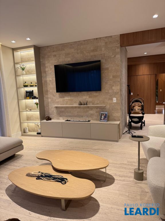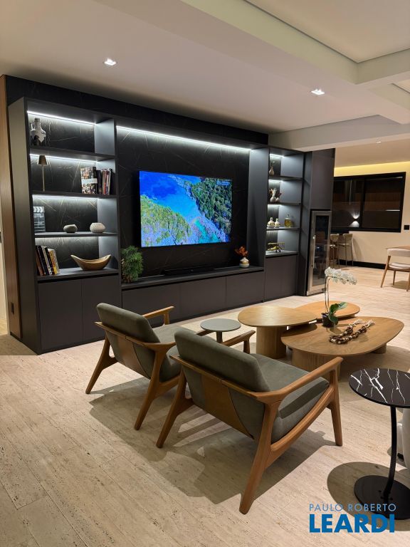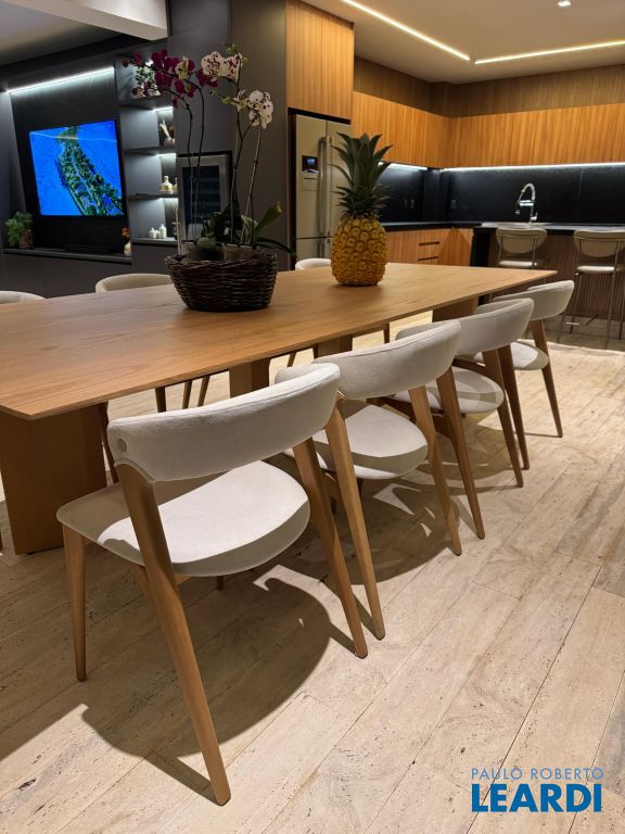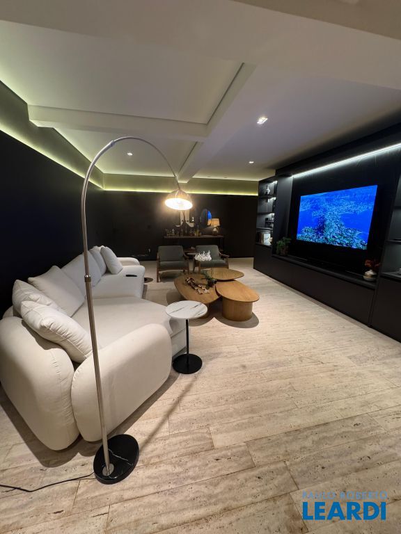 Os pisos em mármore travertino e madeira nobre traduzem o equilíbrio perfeito entre luxo e aconchego. A sala de estar conta com lareira a gás, criando o ambiente ideal para receber amigos e familiares.