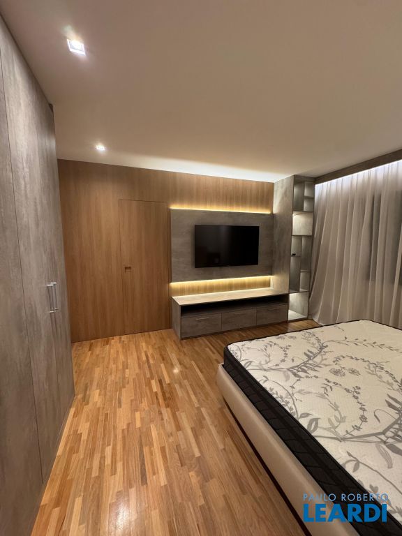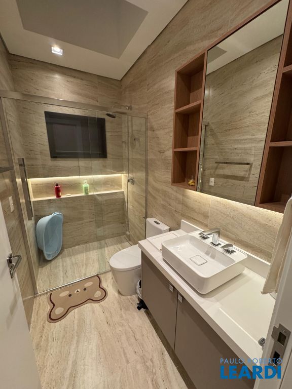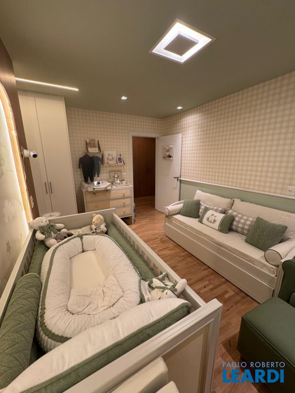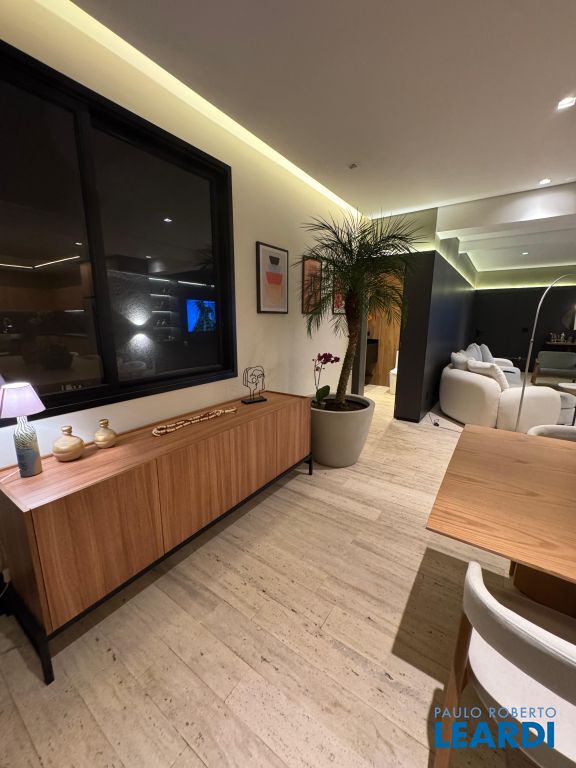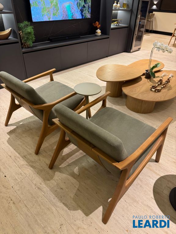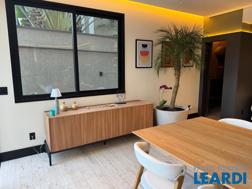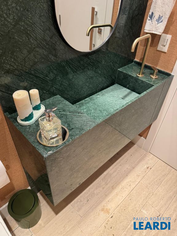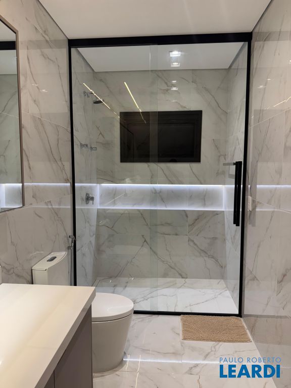 Os pisos em mármore travertino e madeira nobre traduzem o equilíbrio perfeito entre luxo e aconchego. A sala de estar conta com lareira a gás, criando o ambiente ideal para receber amigos e familiares.