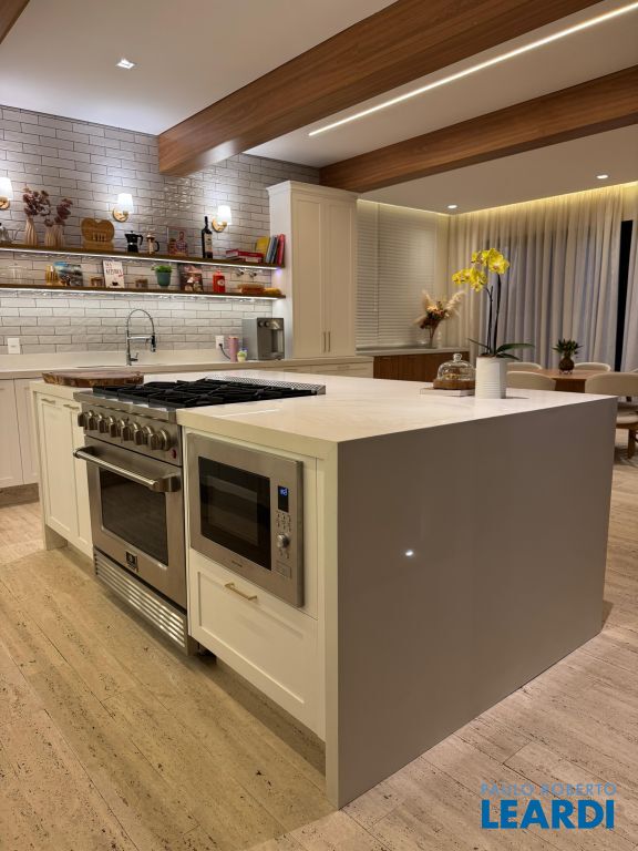 A cozinha e a área gourmet são um espetáculo à parte: totalmente equipadas com eletrodomésticos Elettromec, cervejeira, adegas para vinhos branco e tinto, geladeira, máquina de lavar louças, cooktop, churrasqueira e duas coifas.
