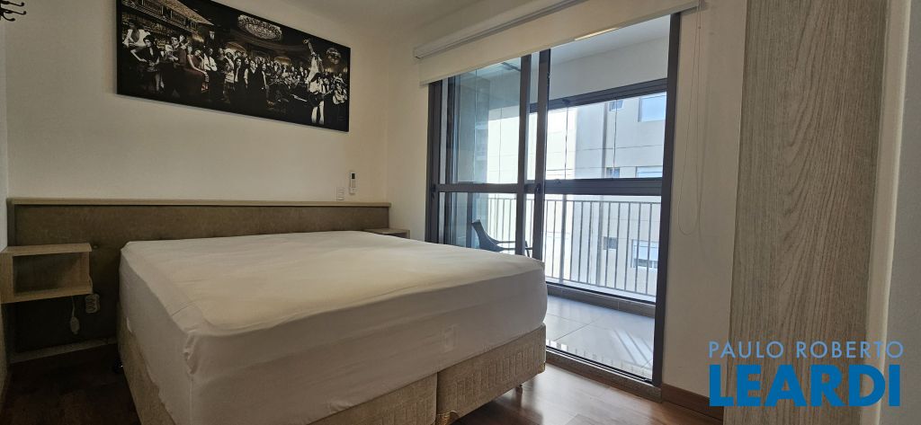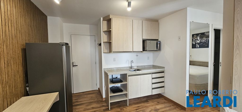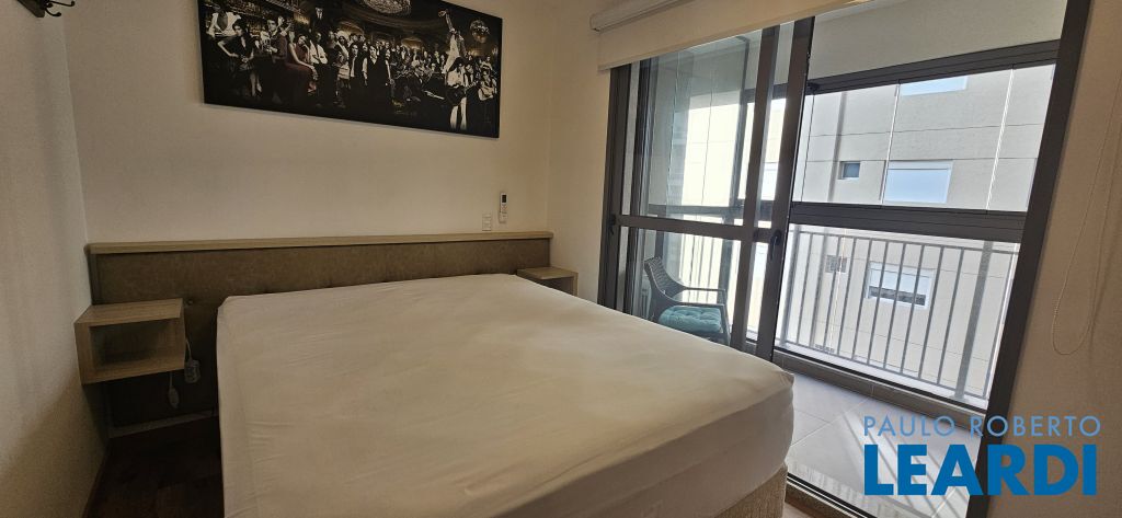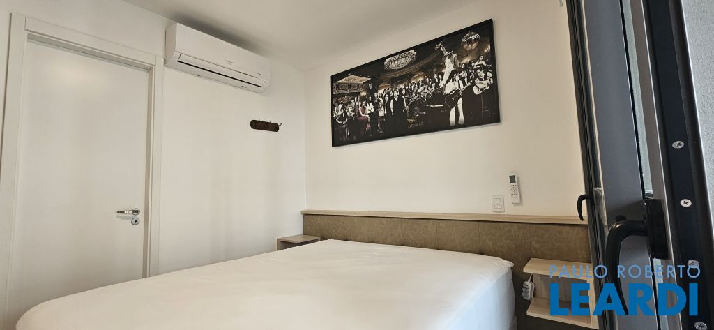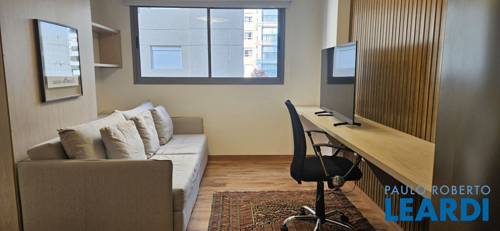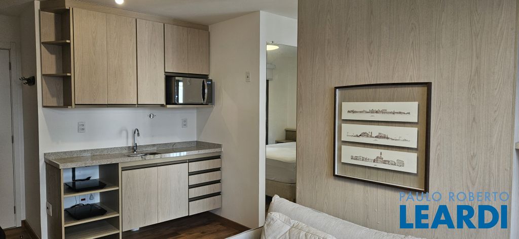 Studio em Moema, decorado e mobiliado, com ar-condicionado, geladeira, micro-ondas, cama, tv e armários.