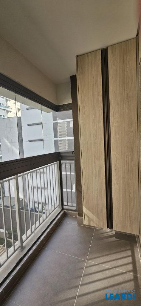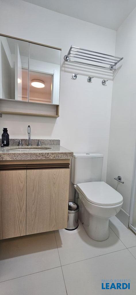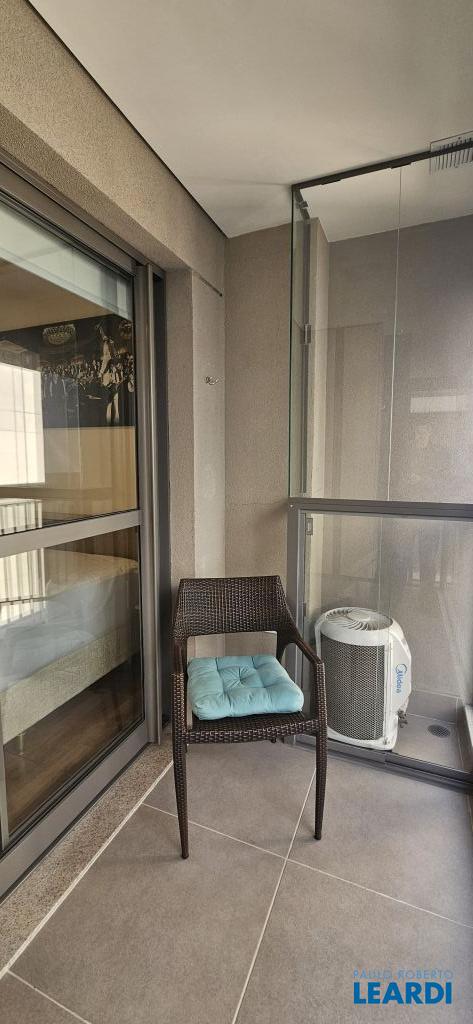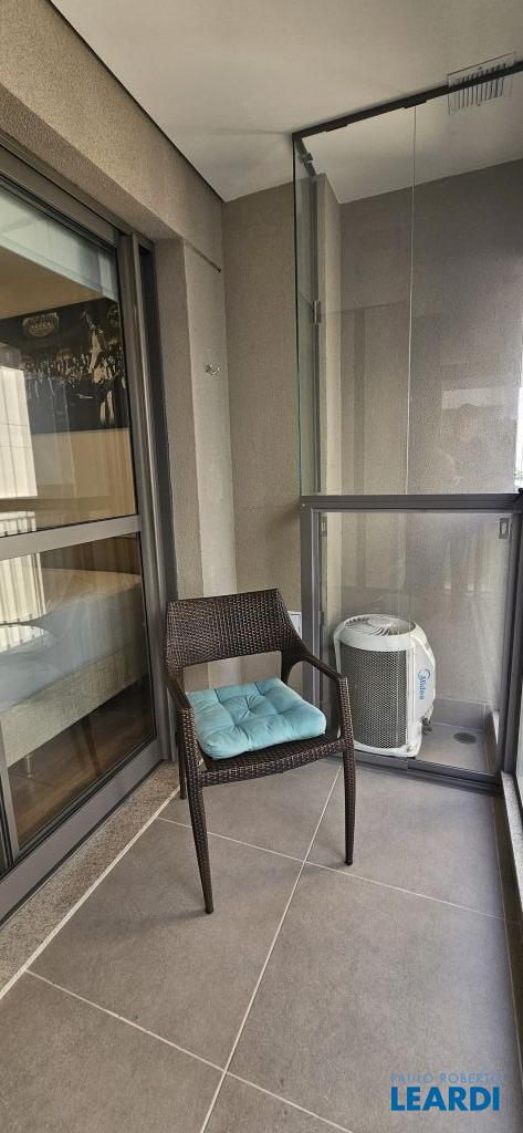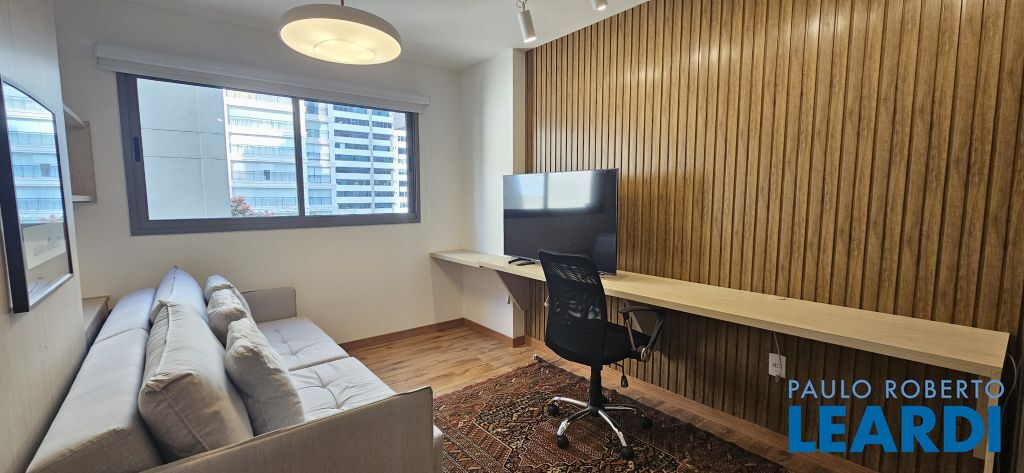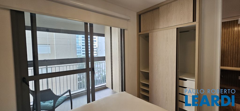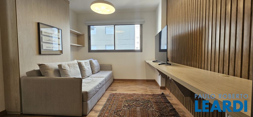 Studio em Moema, decorado e mobiliado, com ar-condicionado, geladeira, micro-ondas, cama, tv e armários.