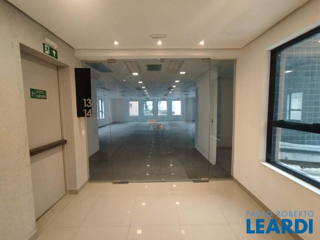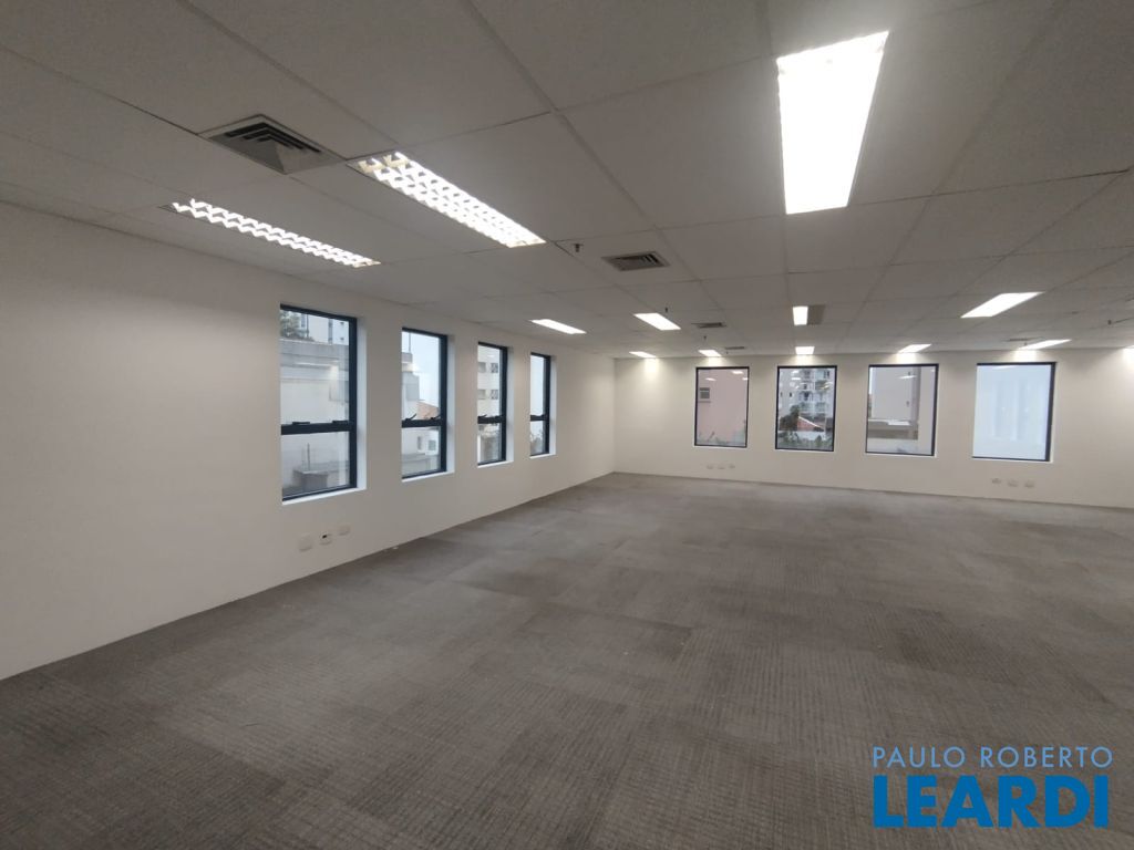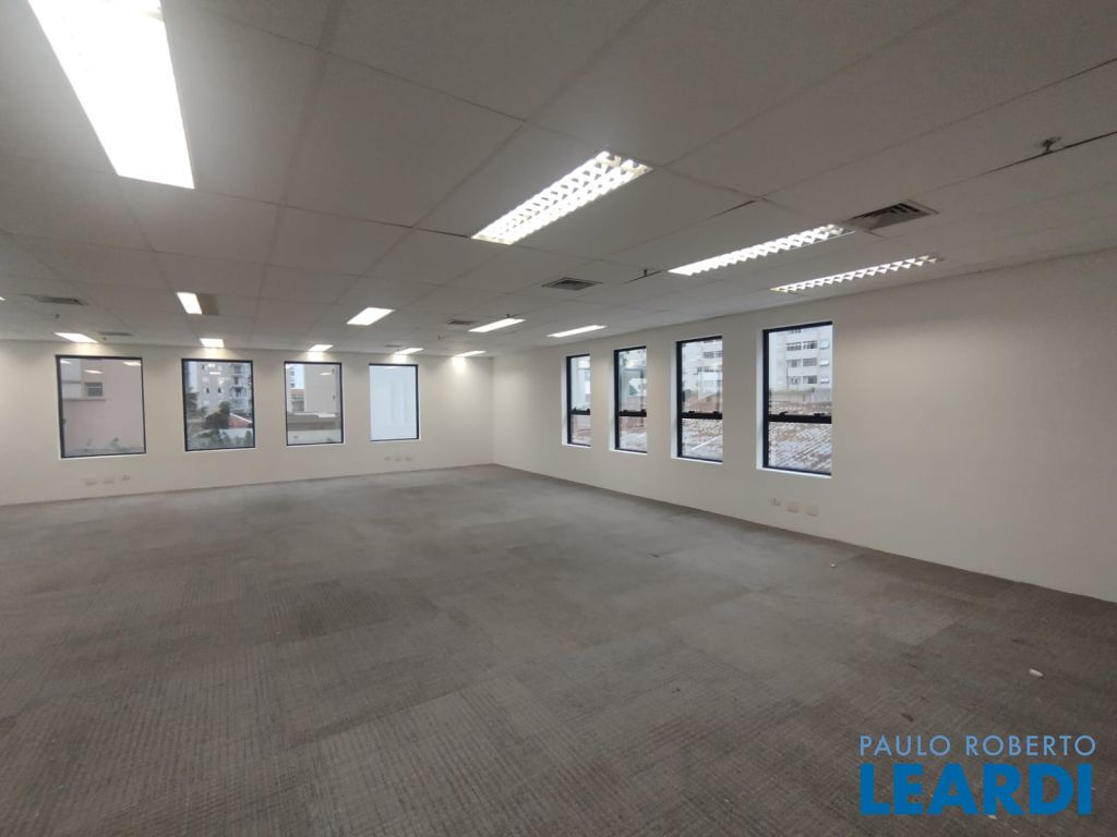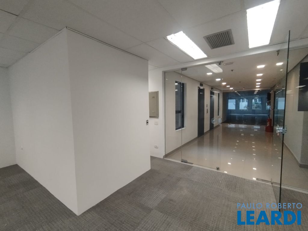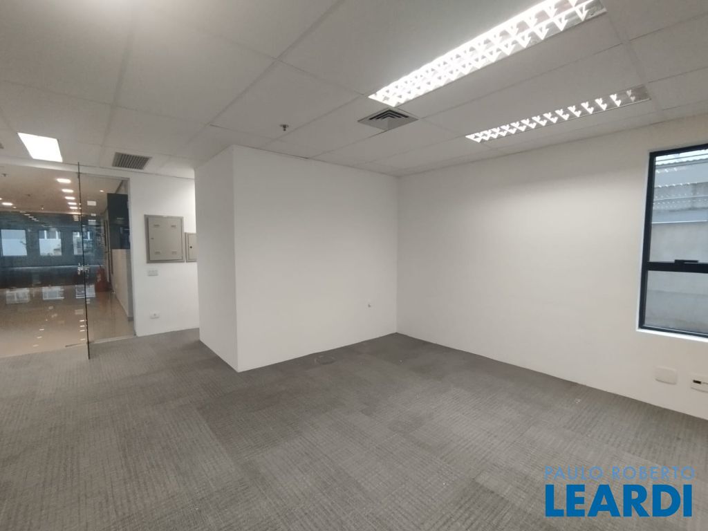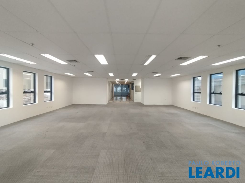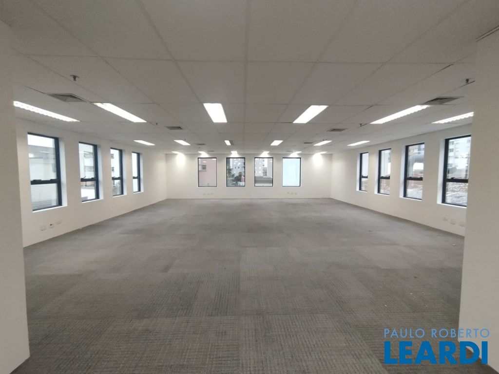 A sala 13 está open space, com carpete, forro, iluminação, 4 banheiros, ponto para copa e ar condicionado.