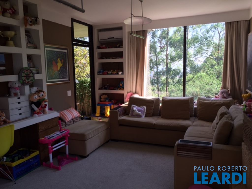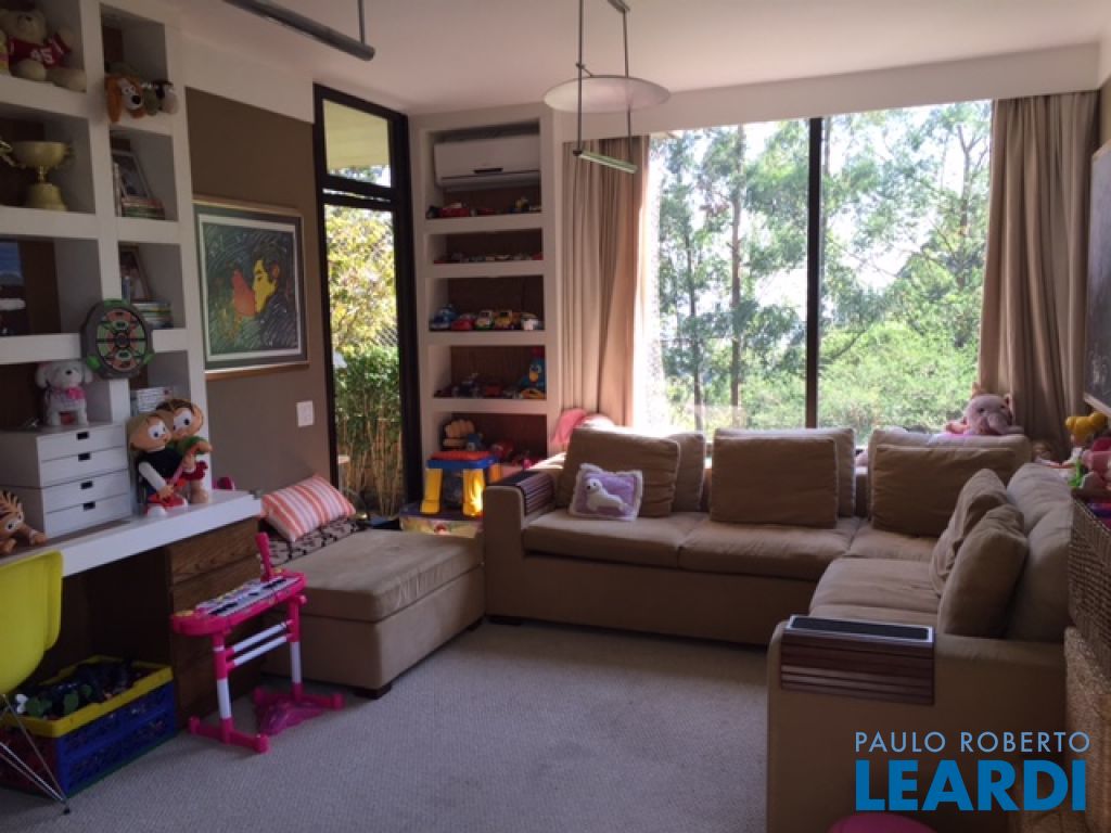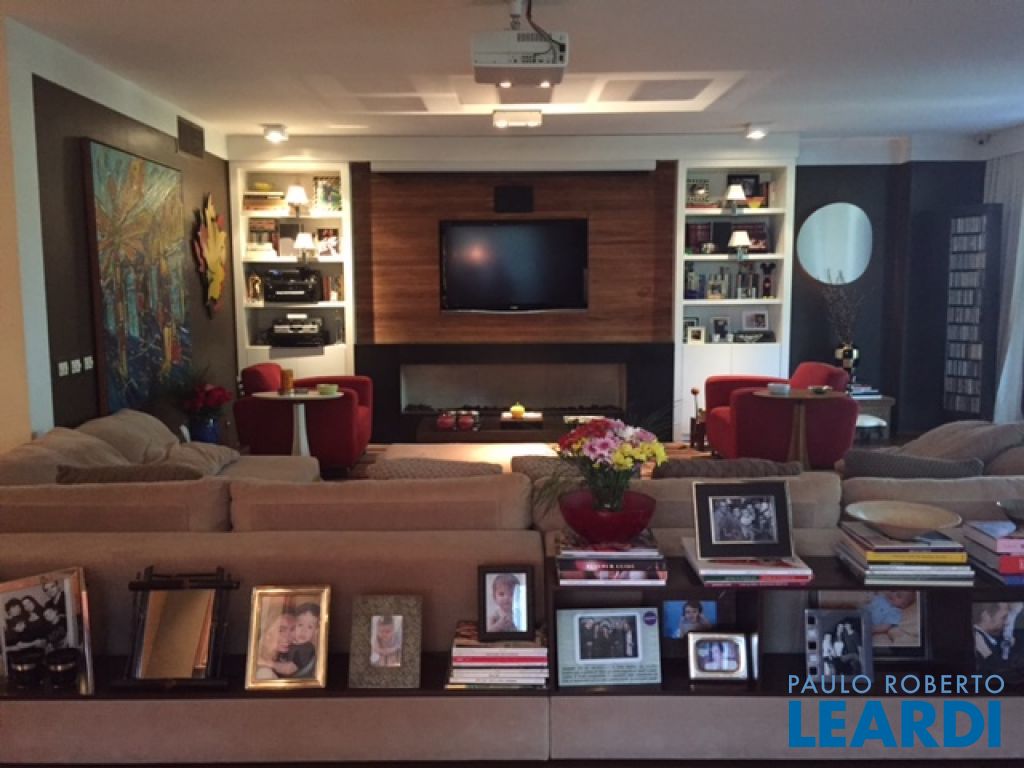Sala de estar com lareira à gas, sala de jantar, sala de TV e lavabo.