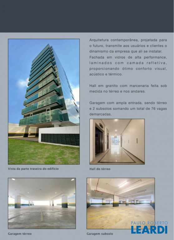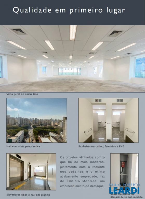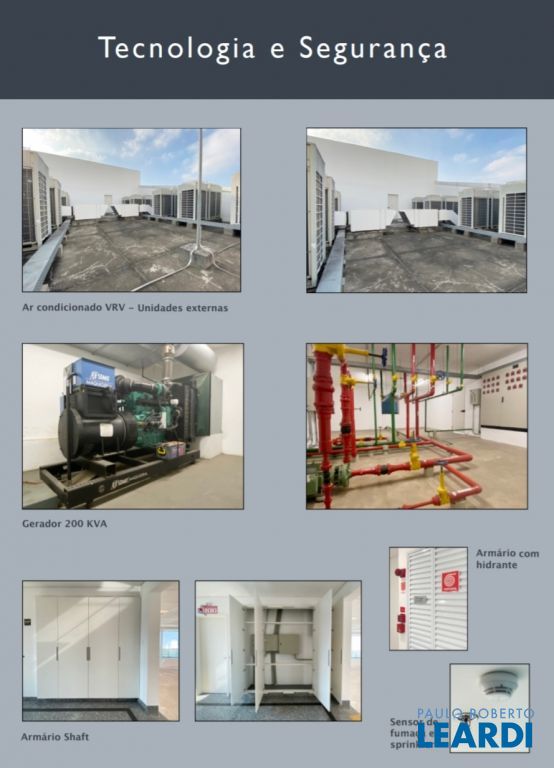 Lajes em vão livre: atende a qualquer layout. Ar condicionado central VRV Daikin: ecológico, com maior economia de energia. Forro mineral modular: Propriedades acústicas e térmicas, além de permitir mobilidade do ar condicionado e luminárias. Preparado para piso elevado em chapas de aço (será fornecido pelos proprietários caso o locatário deseje). Copa, wc masculino, feminino e de necessidades especiais em todos os andares, (não computados na área privativa): Edifício contempla as normas de acessibilidade. 3 Elevadores Atlas, sendo 2 com capacidade para 10 pessoas e 1 com capacidade para 12 pessoas com profundidade para maca (cabine com largura 1,25 metros e profundidade 2,50 metros e porta com largura 1,10 metros e altura 2,10 metros. Gerador. Transformador de potência tipo seco de classe 15KV/ 500 KVA. 120 Metros da estação Metrô São Joaquim.