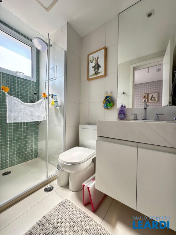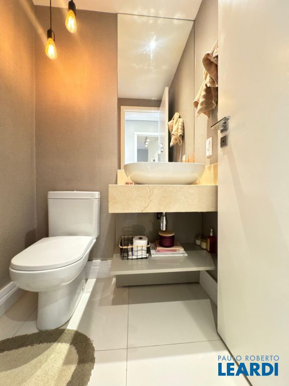 Banheiros elegantes, com revestimentos nobres e detalhes sofisticados.