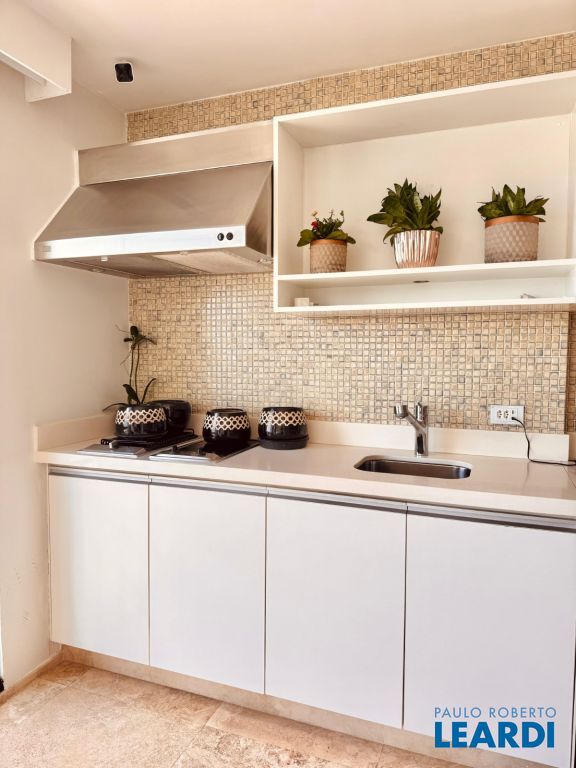 Cozinha com armários e lavanderia arejada