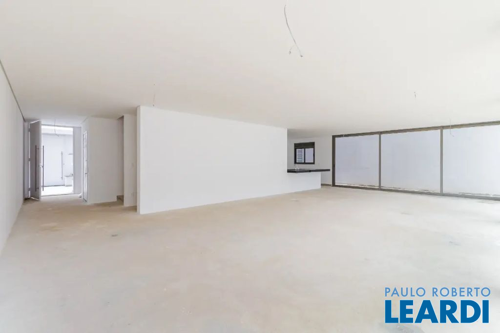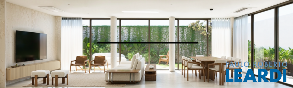 São 450 m², living amplo, 4 suítes, sendo uma master, cozinha, dependência completa para empregada, depósito e 4 vagas de garagem.